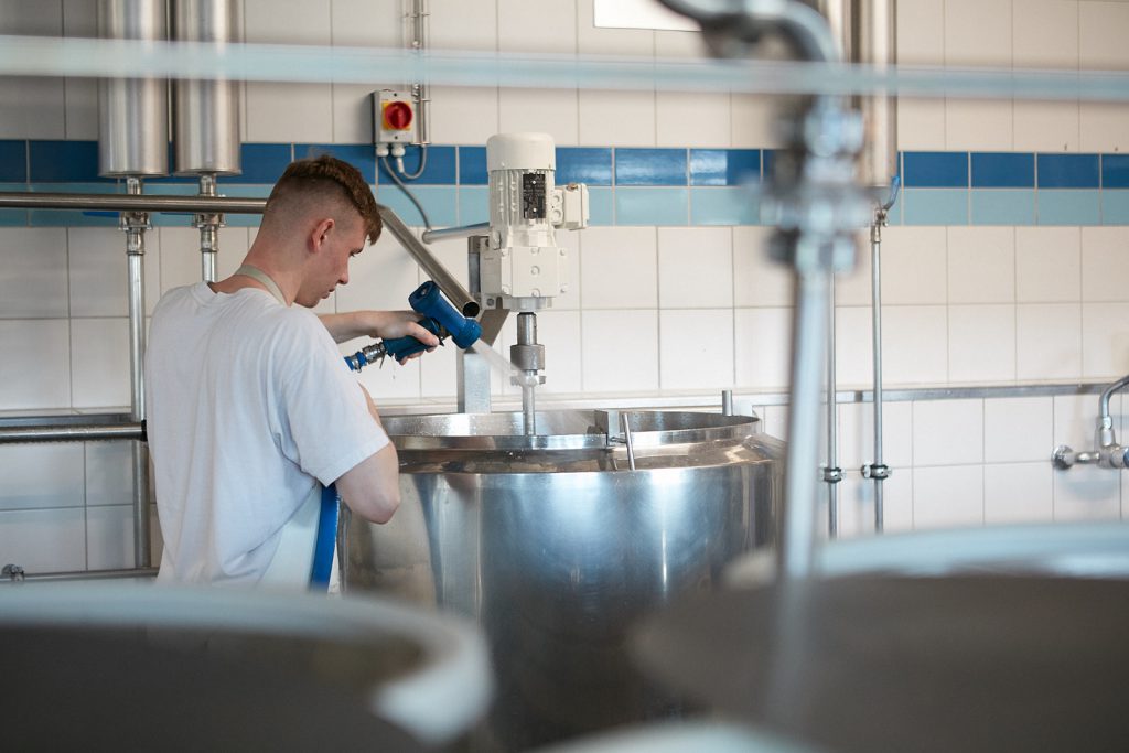 Rinçage à basse pression, nettoyage à la mousse et sous pression des équipements, des sols et des surfaces de la fromagerie.